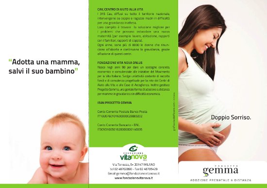Nel 1994 è nato Progetto Gemma, servizio per l’adozione prenatale a distanza di madri in difficoltà, tentate di non accogliere il proprio bambino. Una mamma in attesa nasconde sempre nel suo grembo una gemma (un bambino) che non andrà perduta se qualcuno fornirà l’aiuto necessario. Progetto Gemma offre ad una mamma un sostegno economico che le può consentire di portare a termine con serenità il periodo di gestazione, accompagnandola nel primo anno di vita del bambino. E’ un’idea in più per collaborare con gli oltre 331 Centri di aiuto alla vita che offrono in tutta Italia accoglienza e sostegno alle maternità più contrastate. Il contributo degli adottanti è un segno tangibile di presenza e di aiuto concreto, nonché una prima risposta per dare coraggio alle mamme. Attraverso questo servizio, con un contributo minimo mensile di 160 euro, si può adottare per 18 mesi una mamma e il suo bambino. Chiunque può fare queste adozioni: singoli, famiglie, gruppi parrocchiali, di amici o di colleghi, comunità religiose, condomini e classi scolastiche. Hanno aderito al Progetto anche Consigli comunali e perfino gruppi di carcerati. Spesso l’adozione viene proposta come dono per matrimoni, battesimi, nascite o in ricordo di una persona cara. Dal 1994 al 2011, i bambini nati grazie a Progetto Gemma sono stati circa 15.000 e solo per l’anno 2011 le mamme aiutate sono state più di 1000. Che gioia sapere che un bambino è nato e una madre non ha abortito grazie alla tua solidarietà: sentirsi non solo genitori di un bambino, ma anche fratello o sorella di una mamma che finalmente sorride.